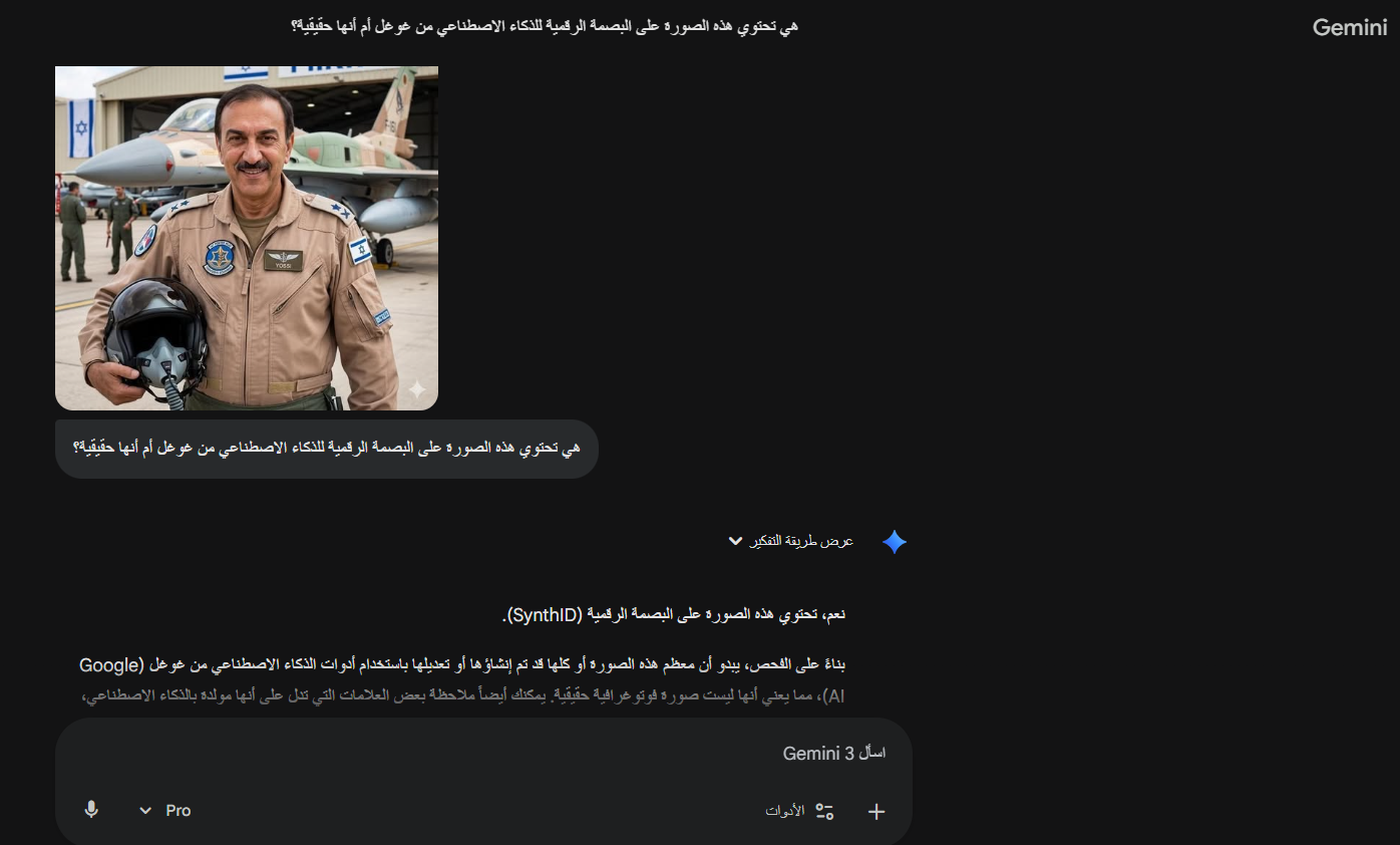 وبالتدقيق في الصورة، يمكن ملاحظة شعار نموذج الاذكاء الاصطناعي “Gemini“ من غوغل، الظاهر أسفل يمين الصورة، ما يشير إلى أنَّها مولّدة بالذكاء الاصطناعي، وهذا ما أكّده نموذج “Gemini” بعد أن حلّل الصورة واكتشف وجود البصمة الرقمية “SynthID” التابعة له، وهي تقنية لوضع علامات مائية رقمية غير مرئية ومدمجة مباشرة في المحتوى الذي يتم توليده بواسطة نماذج الذكاء الاصطناعي من غوغل.