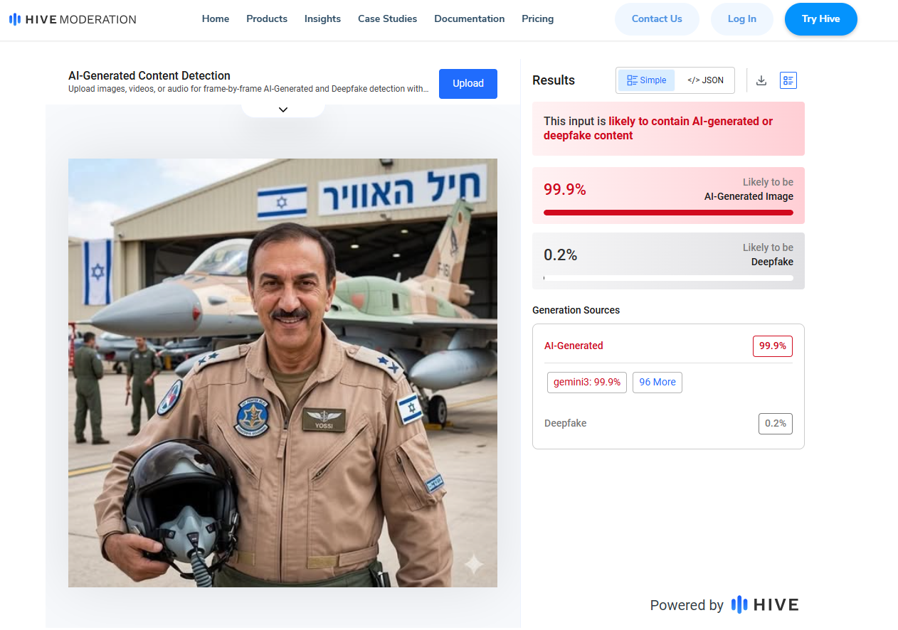 وبتحليل الصورة باستخدام أداة “hive moderation” المختصّة بفحص المحتوى المولّد بالذكاء الاصطناعي، أظهرت نتيجة الفحص أنَّ الصور مولّدة بنسبة 99.9% بالذكاء الاصطناعي، وأثبتت أنَّ التوليد جرى من خلال نموذج “Gemini3“.