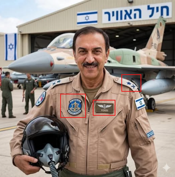 ويمكن ملاحظة علامات التوليد، من خلال التشوهات الظاهرة على الصورة، مثل تشوه الرموز على الرتبة العسكرية واختلاف ألوانها عن الأصلية، فضلاً عن التشوه في الشعار المفترض لجيش الاحتلال الإسرائيلي على يسار البدلة، وكتابة “Yossi” الظاهرة لسبب غير مفهوم على السترة، إذ ليست هناك قوة عسكرية إسرائيلية بهذا الاسم، وفي حال كانت تعتبر اسم للضابط، فالاسم لا يتطابق مع ما يرد في الادّعاء.