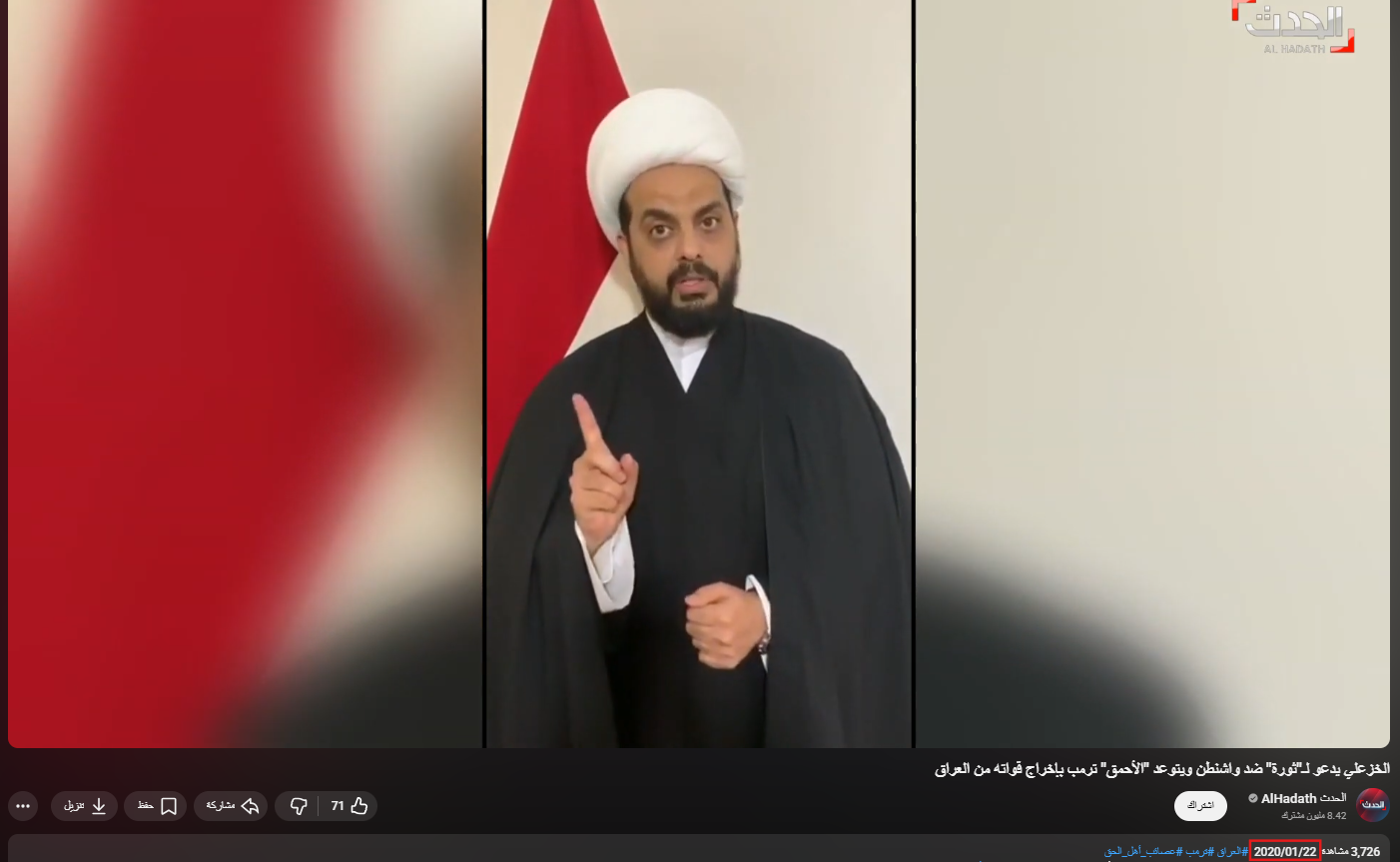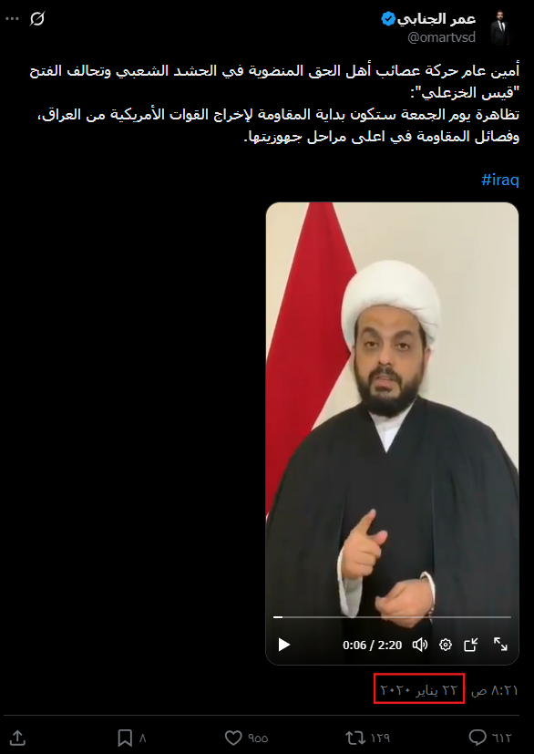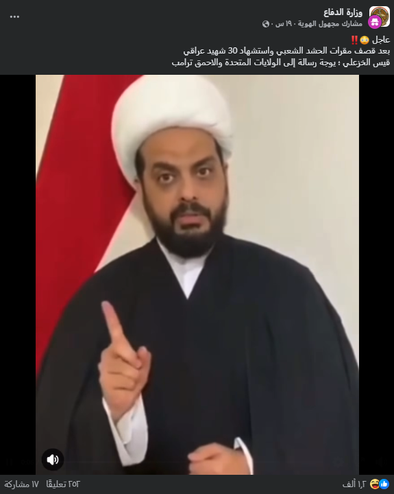تداولت صفحات على مواقع التواصل الاجتماعي، وخصوصاً على منصّة فيسبوك، مقطع فيديو بمزاعم (دون تصرّف): “عاجل بعد قصف مقرات الحشد الشعبي واستشهاد 30 شهيد عراقي قيس الخزعلي ؛ يوجة رسالة إلى الولايات المتحدة والاحمق ترامب”. وحصد الفيديو مئات التفاعلات في منشورات متعدّدة على منصّة فيسبوك حتى لحظة إعداد هذا التحقيق.