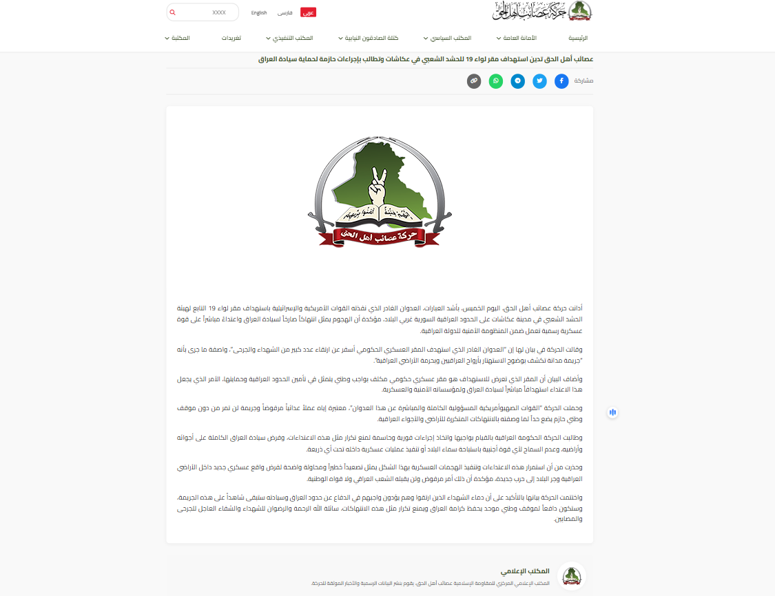 وقالت الحركة في بيانها، إنَّها “أدانت بأشد العبارات، العدوان الغادر الذي نفذته القوات الأميركية والإسرائيلية باستهداف مقر لواء 19 التابع لهيئة الحشد الشعبي في مدينة عكاشات على الحدود العراقية السورية غربي البلاد”، وأكّدت على أنَّ “الهجوم يمثل انتهاكاً صارخاً لسيادة العراق واعتداءً مباشراً على قوة عسكرية رسمية تعمل ضمن المنظومة الأمنية للدولة العراقية”.
