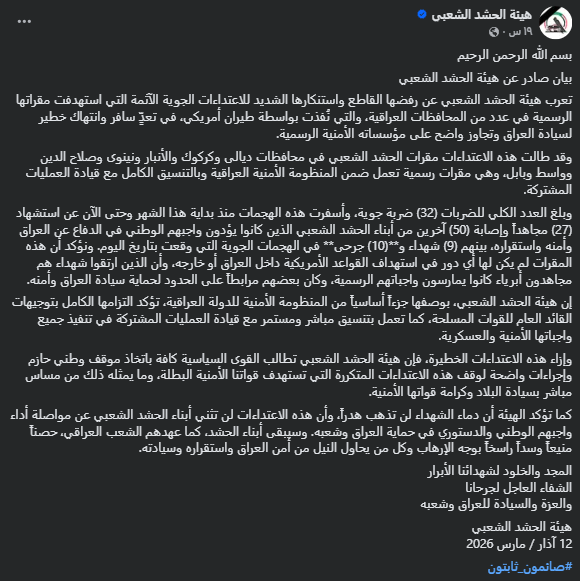 لقطة شاشة لبيان هيئة الحشد الشعبي (فيسبوك)