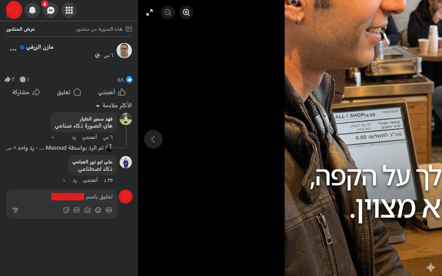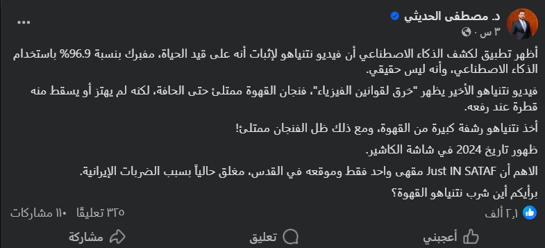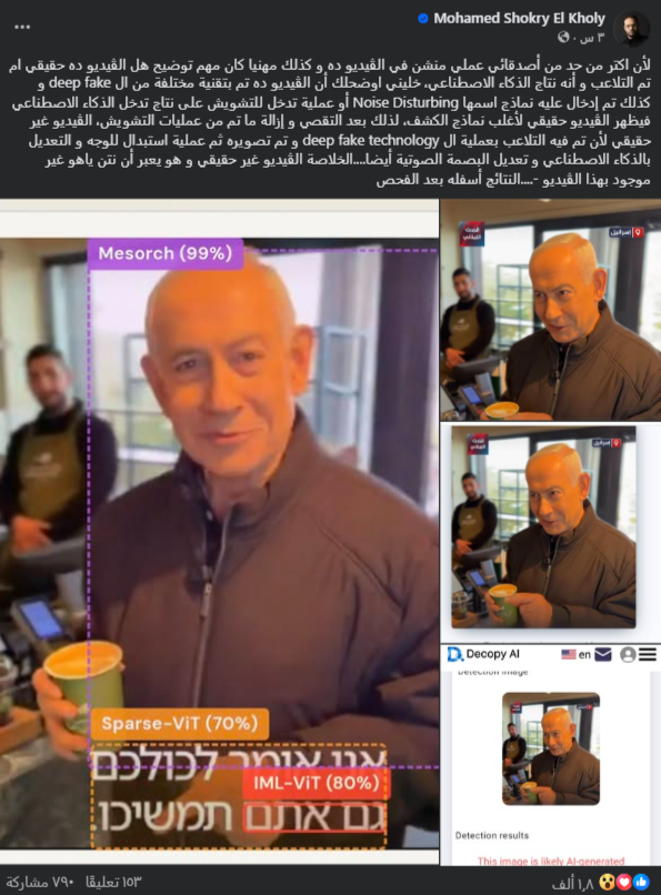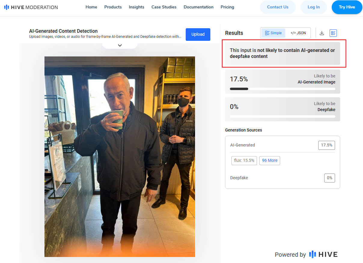 كما نشر حساب المقهى منشوراً احتوى ثلاث صور لنتنياهو خلال زيارته، تتّضح من خلالها التطابقات في كل عناصرها مع الفيديو المنشور في حساب نتنياهو، مثل الملابس والقهوة وموظّفة صندوق الدفع. وهذا يدحض فرضية توليد الفيديو بالذكاء الاصطناعي لتوفّر صور وفيديوهات من زوايا مختلفة لم تظهر عليها أي علامات توليد، فضلاً عن أنَّ نتيجة فحصنا لواحدة من الصور عبر أداة “hive moderation” المختصّة بفحص المحتوى المولّد، عزّزت بأنَّها حقيقية.