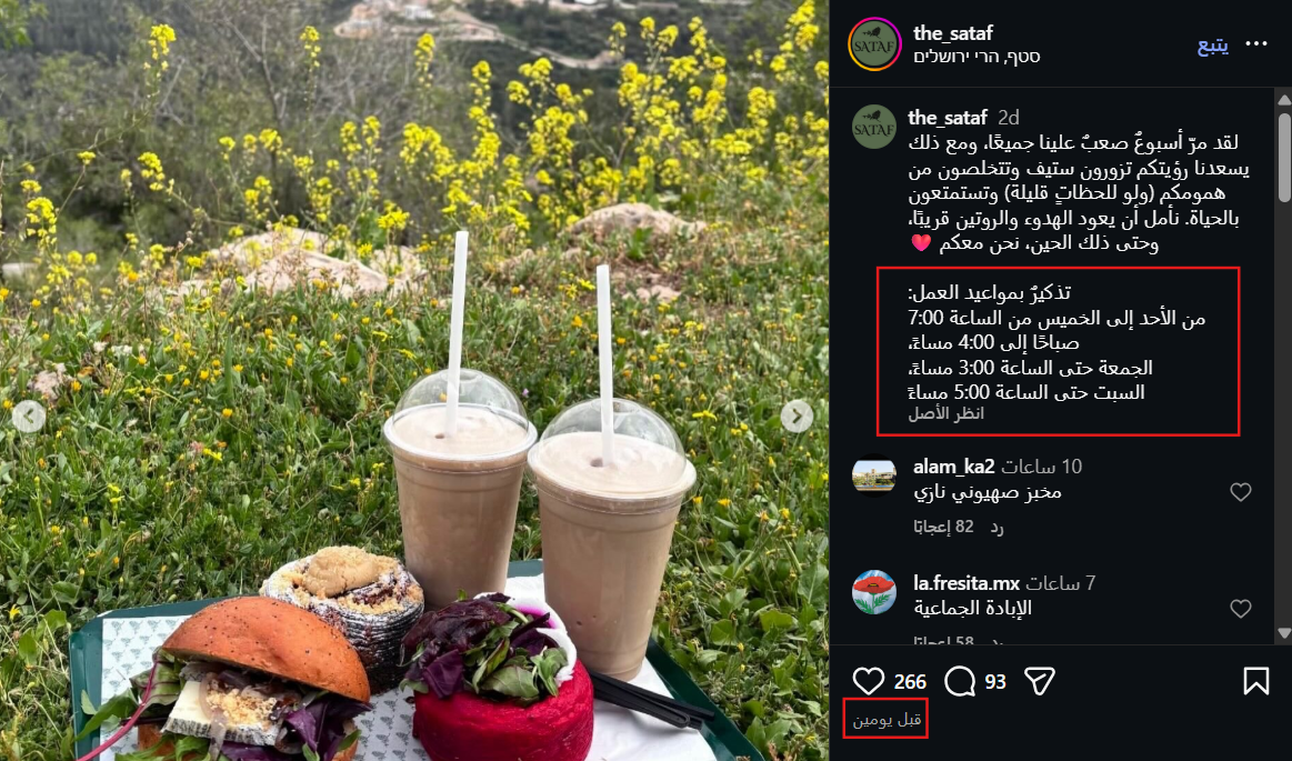 وبالبحث في معلومات الحساب ومحتواه، تبيّن أنَّه لم يكن مغلقاً، إذ شارك منشوراً قبل يومين من إعداد هذا التحقيق، دعا فيه الزبائن إلى زيارته، وذكر الأوقات التي يفتح فيها، ما يعني أنَّ المقهى مفتوح قبل يومين على الأقل من زيارة نتنياهو إليه، بالإضافة إلى أنَّ لم يعلن إغلاقه خلال الشهر الجاري، بل استمر بنشر وصفات الأكلات والترويج لزيارته. وهذا يدحض ادّعاء إغلاق المقهى.