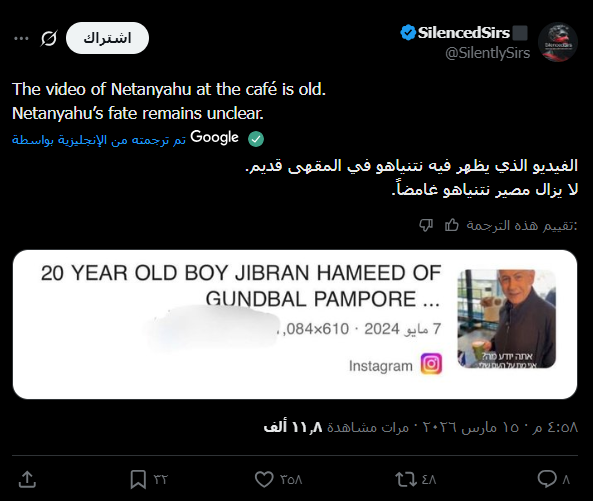 وينتشر هذا التضارب المعلوماتي بالتزامن مع الأخبار التي انتشرت على مواقع التواصل الاجتماعي، حول مقتل أو إصابة رئيس وزراء الاحتلال الإسرائيلي بنيامين نتنياهو، إثر الضربات الإيرانية على الأراضي المحتلّة، في سياق الحرب الأميركية-الإسرائيلية على إيران، والتي دخلت أسبوعها الثالث منذ بدايتها مطلع شهر آذار الجاري.