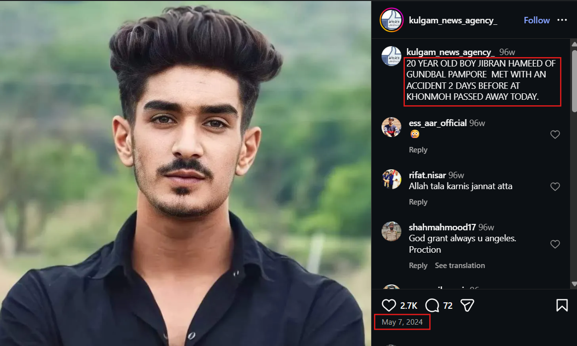 عند النظر إلى اللقطة المنشورة، يمكن ملاحظة العنوان الذي يظهر بجانب الفيديو، هو YEAR OLD BOY JIBRAN HAMEED OF GUNDBAL PAMPORE…” 20″، وعند نسخه والبحث عنه تبيّن أنَّه عنوان لمنشور يوم 7 أيار 2024، ولكن ليس له علاقة بنتنياهو بل بشاب توفي في الهند بحادث آنذاك، ما يشير إلى حصول خلل تقني في تقنيات البحث العكسي، دمجت بين المنشور الحقيقي للشاب وفيديو نتنياهو، بحيث أصبح صورة غلاف لنتيجة البحث، وهذا ما يفسّر عدم نشر مصادر الادّعاء رابط الفيديو فيما لو كان قديماً، لأنَّ ليس له رابط في الأصل.