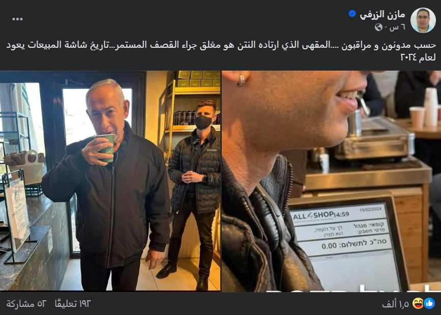 نشرت صفحات على مواقع التواصل الاجتماعي، مؤخّراً، مزاعم متعدّدة حول الفيديو الذي نشره رئيس وزراء الاحتلال الإسرائيلي، بنيامين نتنياهو يوم أمس 15 آذار 2026، منها أنَّه قديم ويعود إلى 2024، وأخرى ادّعت أنَّ المقهى الذي زاره نتنياهو مغلق حالياً بسبب الحرب.