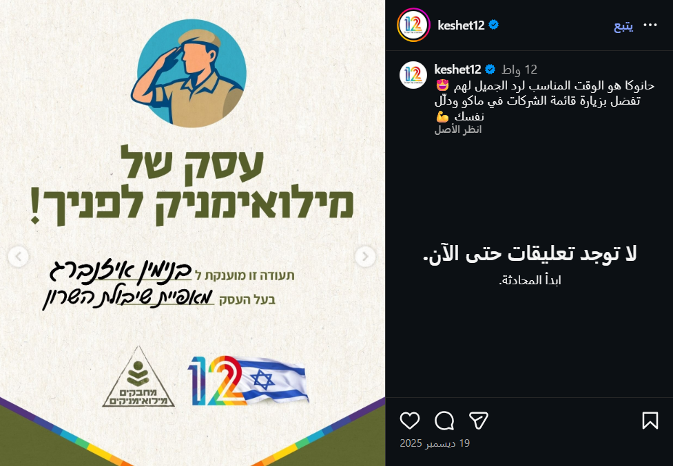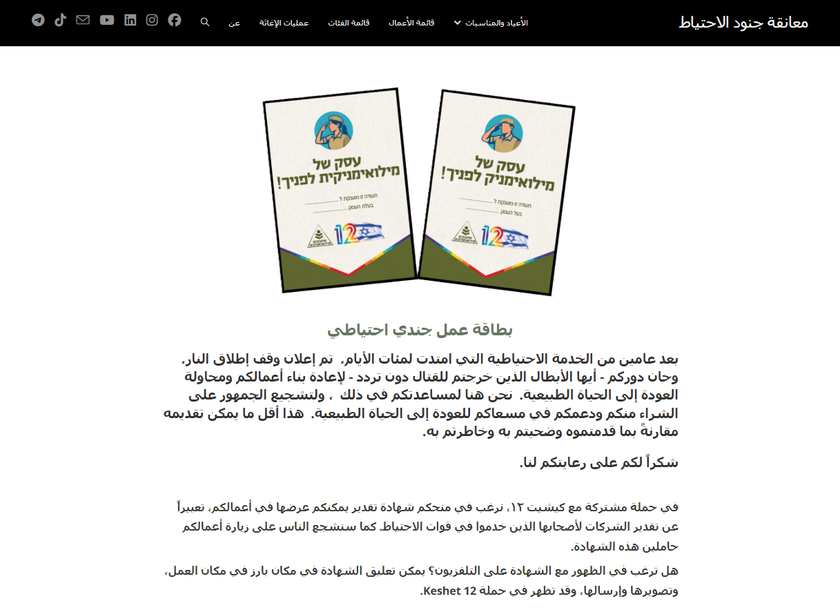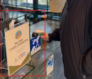 بالنظر إلى الثواني الأولى من الفيديو الذي نشره نتنياهو، يمكن ملاحظة لافتة بيضاء وأخرى صغيرة باللون الأزرق، وعند البحث عن الأولى توصّلنا الى ما تعنيه، وهي لافتة تشير إلى أنَّ المشروع التجاري يدار أو يملكه جندي احتياط حالي أو سابق في جيش الاحتلال الإسرائيلي، وتستخدم العلامة لدعم أعمال جنود الاحتياط.