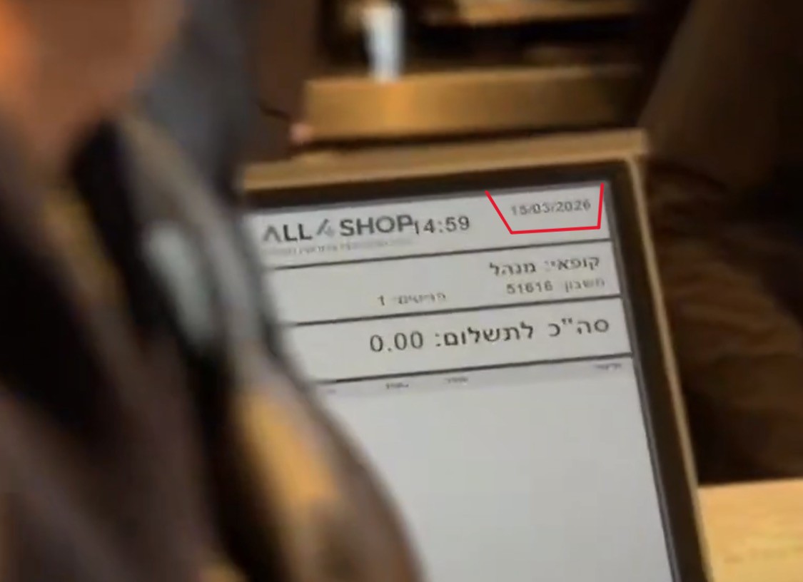 عدنا إلى النسخة الأصلية من الفيديو الذي نشره نتنياهو، وراجعناها ثانية بثانية، وتبيّن أنَّ اللقطة الأوضح لشاشة جهاز الدفع الإلكتروني كانت عند الثانية وأجزائها (00:57:17) بالتحديد، ويتّضح التاريخ بشكل واقعي وليس بدقّة مبالغ بها وغير منطقية، هو (15/03/2026)، أي بتاريخ يوم الأمس.