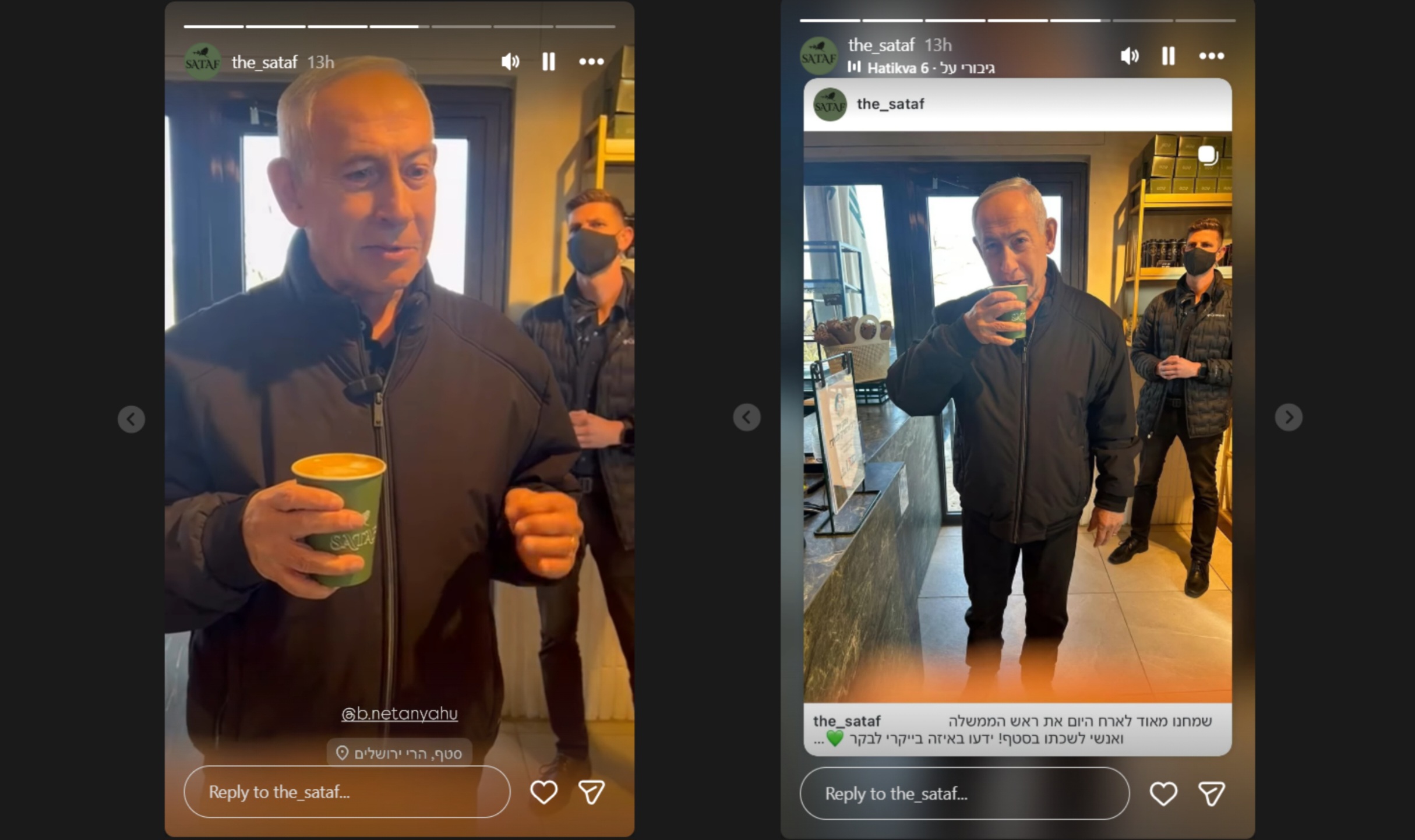 واستكمالاً لعملية التحقق من تاريخ الالتقاط، ادّعت بعض الصفحات أنَّ الفيديو قديم لأنَّ “المقهى مغلق خلال الحرب”، وهنا راجعنا الحساب الرسمي للمقهى الذي زاره نتنياهو، والذي توصلنا إليه عبر التدقيق في ملابس العامل الذي يعمل فيه، حيث يتّضح اسم المقهى بالإنجليزية “SATAF”.