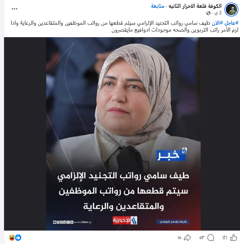 تداولت صفحات على مواقع التواصل الاجتماعي، وخصوصاً على منصّة فيسبوك، خبراً بمزاعم (دون تصرّف): “#عاجل #الان طيف سامي رواتب التجنيد الإلزامي سيتم قطعها من رواتب الموظفين والمتقاعدين والرعاية واذا لزم الأمر راتب التربوين والصحه موجودات ادوافيع مايقصرون”. ومرفق بصورة مصممة بقالب إخباري خاص بقناة “العراقية الإخبارية”. وحصد الادعاء مئات التفاعلات على منصة فيسبوك.