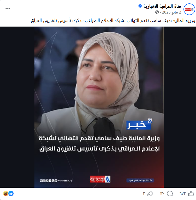 وبالبحث العكسي عن صورة الخبر، اتّضح أنَّها مفبركة وتم التلاعب بها بأحد برامج تعديل الصور، إذ نشرت الصورة الأصلية في صفحة قناة “العراقية الإخبارية” على منصّة فيسبوك يوم 2 أيار 2025، واحتوت على خبر مفاده: “وزيرة المالية طيف سامي تقدم التهاني لشبكة الإعـلام الــعراقي بـذكرى تأسيس تلفزيون العراق”. وليس كما تم الادعاء.